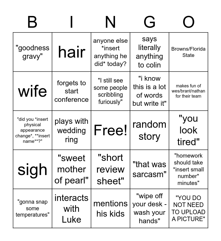 This bingo card has a free space and 24 words: "sweet mother of pearl", interacts with Luke, "I still see some people scribbling furiously", "gonna snap some temperatures", Browns/Florida State, "goodness gravy", wife, hair, random story, "short review sheet", "i know this is a lot of words but write it", "did you *insert physical appearance change*, **insert name**?", "that was sarcasm", "homework should take *insert small number* minutes", forgets to start conference, "wipe off your desk - wash your hands", "you look tired", anyone else *insert anything he did* today?, makes fun of wes/brant/nathan for their team, plays with wedding ring, "YOU DO NOT NEED TO UPLOAD A PICTURE", sigh, says literally anything to colin and mentions his kids.