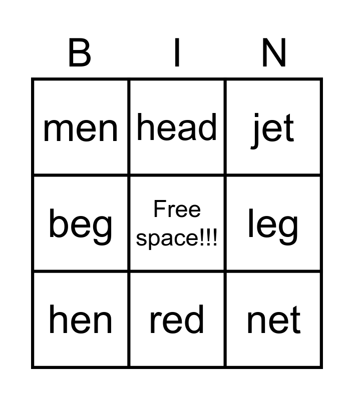 This bingo card has a free space and 8 words: leg, jet, head, hen, men, net, beg and red.