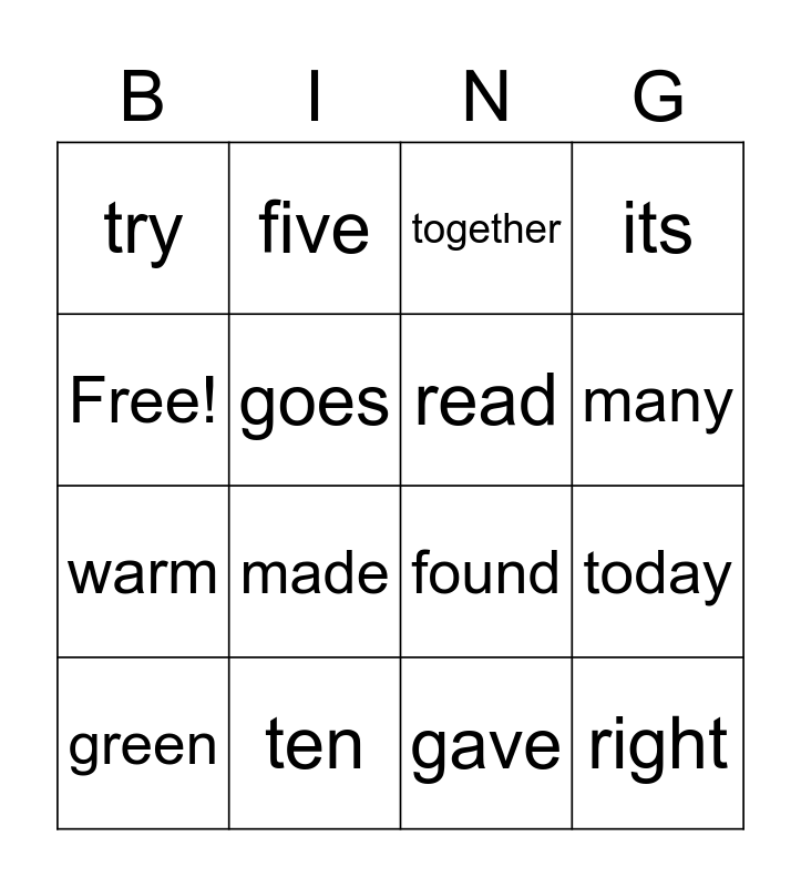 This bingo card has 16 words: ten, today, together, try, warm, five, found, gave, Free!, goes, green, its, made, many, read and right.