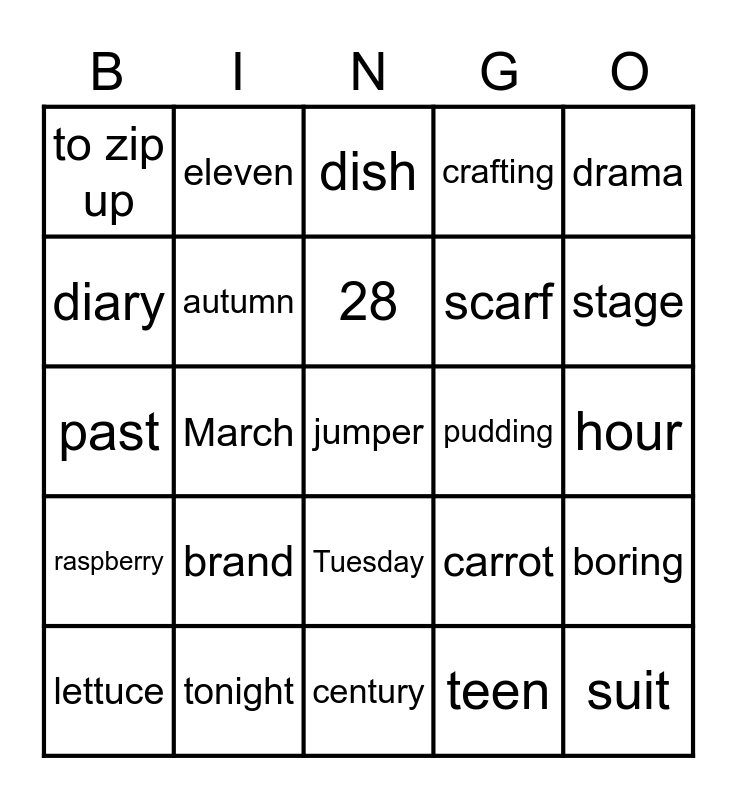 This bingo card has 25 words: brand, century, 28, lettuce, drama, to zip up, diary, eleven, pudding, Tuesday, scarf, past, carrot, boring, autumn, suit, hour, dish, stage, March, jumper, tonight, raspberry, crafting and teen.