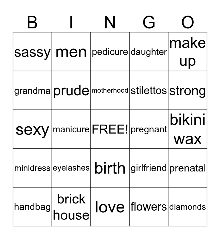 This bingo card has a free space and 24 words: eyelashes, brick house, motherhood, handbag, make up, sassy, grandma, men, pregnant, birth, stilettos, sexy, girlfriend, prenatal, prude, flowers, bikini wax, pedicure, strong, manicure, diamonds, minidress, daughter and love.
