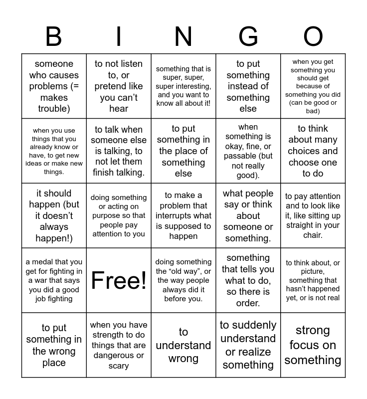 This bingo card has 25 words: Free!, to understand wrong, to put something in the place of something else, to put something in the wrong place, when you get something you should get because of something you did (can be good or bad), someone who causes problems (= makes trouble), when you use things that you already know or have, to get new ideas or make new things., to not listen to, or pretend like you can’t hear, what people say or think about someone or something., doing something the “old way”, or the way people always did it before you., when something is okay, fine, or passable (but not really good)., it should happen (but it doesn’t always happen!), something that tells you what to do, so there is order., to think about, or picture, something that hasn’t happened yet, or is not real, to talk when someone else is talking, to not let them finish talking., strong focus on something, to pay attention and to look like it, like sitting up straight in your chair., something that is super, super, super interesting, and you want to know all about it!, to think about many choices and choose one to do, doing something or acting on purpose so that people pay attention to you, to make a problem that interrupts what is supposed to happen, when you have strength to do things that are dangerous or scary, a medal that you get for fighting in a war that says you did a good job fighting, to put something instead of something else and to suddenly understand or realize something.