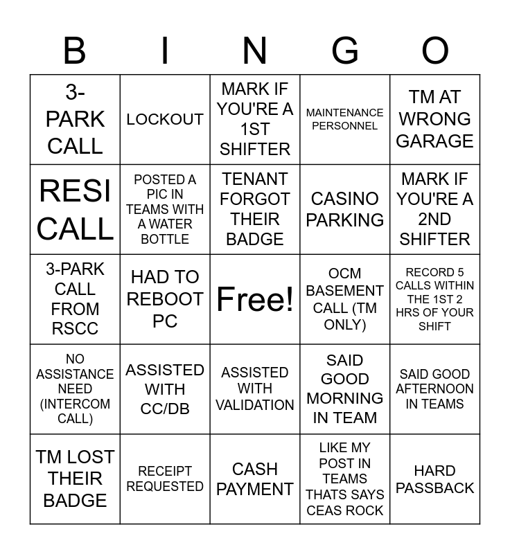 This bingo card has a free space and 24 words: ASSISTED WITH CC/DB, RECEIPT REQUESTED, TENANT FORGOT THEIR BADGE, TM LOST THEIR BADGE, TM AT WRONG GARAGE, 3-PARK CALL, RESI CALL, LOCKOUT, OCM BASEMENT CALL (TM ONLY), ASSISTED WITH VALIDATION, CASINO PARKING, 3-PARK CALL FROM RSCC, SAID GOOD MORNING IN TEAM, SAID GOOD AFTERNOON IN TEAMS, POSTED A PIC IN TEAMS WITH A WATER BOTTLE, LIKE MY POST IN TEAMS THATS SAYS CEAS ROCK, RECORD 5 CALLS WITHIN THE 1ST 2 HRS OF YOUR SHIFT, MARK IF YOU'RE A 1ST SHIFTER, MARK IF YOU'RE A 2ND SHIFTER, HAD TO REBOOT PC, HARD PASSBACK, NO ASSISTANCE NEED (INTERCOM CALL), MAINTENANCE PERSONNEL and CASH PAYMENT.