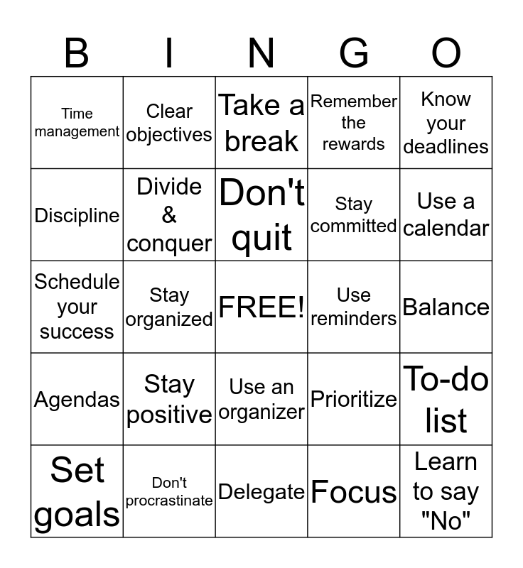 This bingo card has a free space and 24 words: Stay positive, Don't procrastinate, Don't quit, Set goals, Know your deadlines, Time management, Discipline, Clear objectives, Use reminders, Use an organizer, Stay committed, Schedule your success, Prioritize, To-do list, Divide & conquer, Focus, Balance, Take a break, Use a calendar, Stay organized, Learn to say "No", Agendas, Remember the rewards and Delegate.