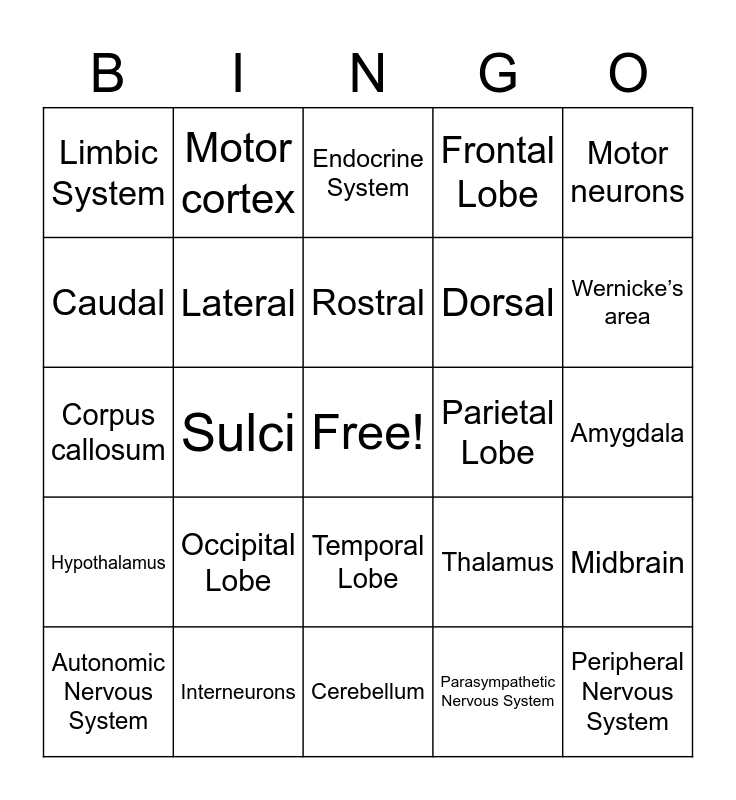 This bingo card has a free space and 45 words: Central Nervous System, Peripheral Nervous System, Somatic Nervous System, Autonomic Nervous System, Sympathetic Nervous System, Parasympathetic Nervous System, Endocrine System, Sensory neurons, Motor neurons, Interneurons, Frontal Lobe, Parietal Lobe, Temporal Lobe, Occipital Lobe, Cerebrum, Cerebellum, Cerebral cortex, Corpus callosum, Broca’s area, Wernicke’s area, Motor cortex, Somatosensory cortex, Pituitary gland, Limbic System, Hippocampus, Amygdala, Cingulate gyrus, Mammillary bodies, Thalamus, Hypothalamus, Brainstem, Midbrain, Pons, Medulla oblongata, Gyri, Sulci, White matter, Gray matter, Ventricles, Rostral, Caudal, Dorsal, Ventral, Lateral and Medial.