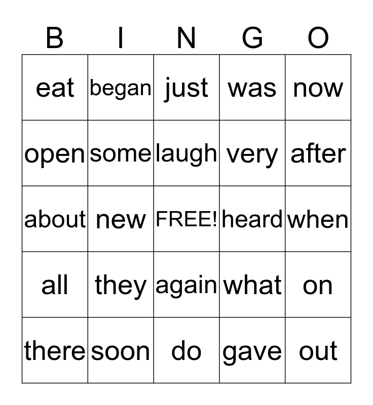 This bingo card has a free space and 24 words: they, soon, laugh, there, now, eat, open, began, heard, again, very, about, what, on, some, gave, when, just, after, new, out, all, was and do.