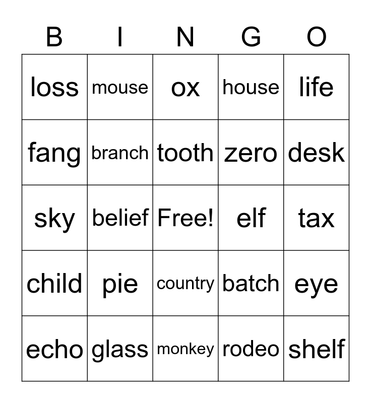 This bingo card has a free space and 34 words: loaf, rodeo, moose, troop, child, branch, life, echo, mouse, zoo, tooth, ox, goose, fish, elf, desk, glass, sky, pie, batch, country, potato, loss, tax, monkey, shelf, house, deer, zero, fang, liberty, belief, eye and animal.