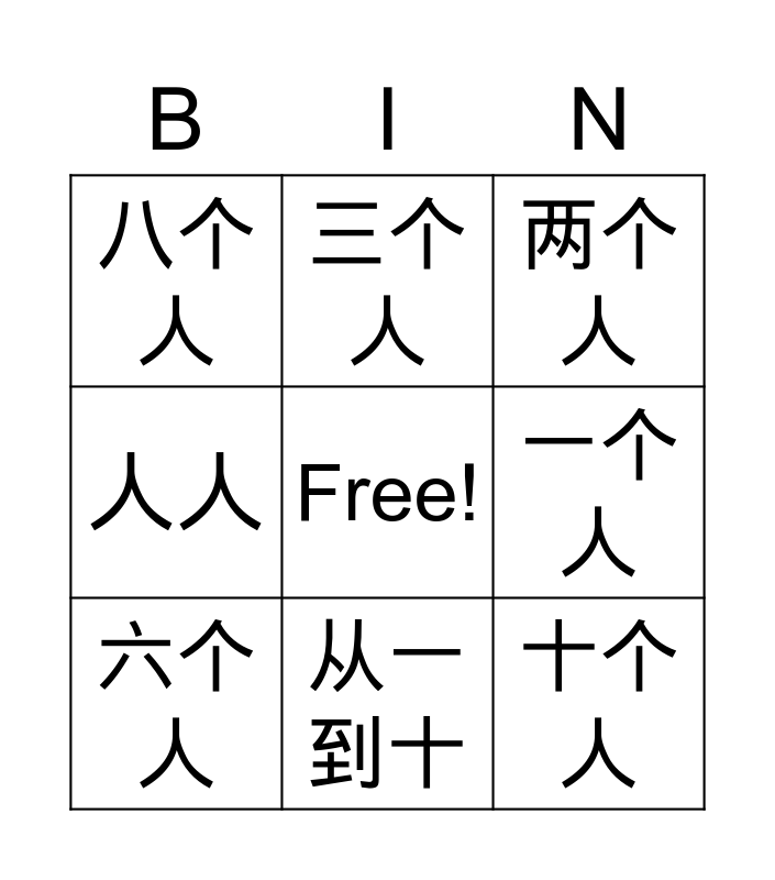 This bingo card has a free space and 8 words: 一个人, 两个人, 三个人, 六个人, 八个人, 十个人, 人人 and 从一到十.