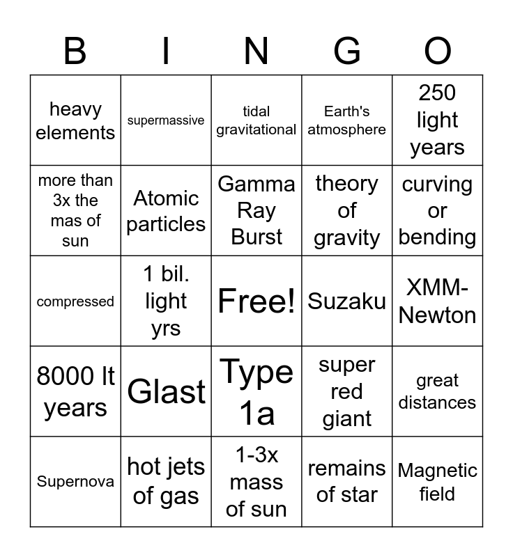 This bingo card has a free space and 39 words: Gamma-Rays, black holes, X-rays, Atomic particles, Supernova, Type 1a, Gamma Ray Burst, 30 light years, 250 light years, 8000 lt years, 1 bil. light yrs, Earth's atmosphere, Magnetic field, XMM-Newton, Suzaku, Glast, Swift, heavy elements, white dwarf, super red giant, more than 3x the mas of sun, 1-3x mass of sun, theory of gravity, curving or bending, speed of light, gravitational force, 200 bil., Millions, stellar mass, supermassive, mid-mass, weightlessness, tidal gravitational, hot jets of gas, remains of star, hot radiation, great distances, compressed and ripped apart.