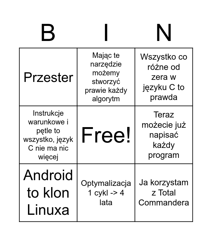This bingo card has a free space and 9 words: Android to klon Linuxa, Wszystko co różne od zera w języku C to prawda, Mając te narzędzie możemy stworzyć prawie każdy algorytm, Instrukcje warunkowe i pętle to wszystko, język C nie ma nic więcej, Przester, Teraz możecie już napisać każdy program, Ja korzystam z Total Commandera, Mówi o niedokładności przedstawiania liczb zmiennoprzecinkowych and Optymalizacja 1 cykl -> 4 lata.