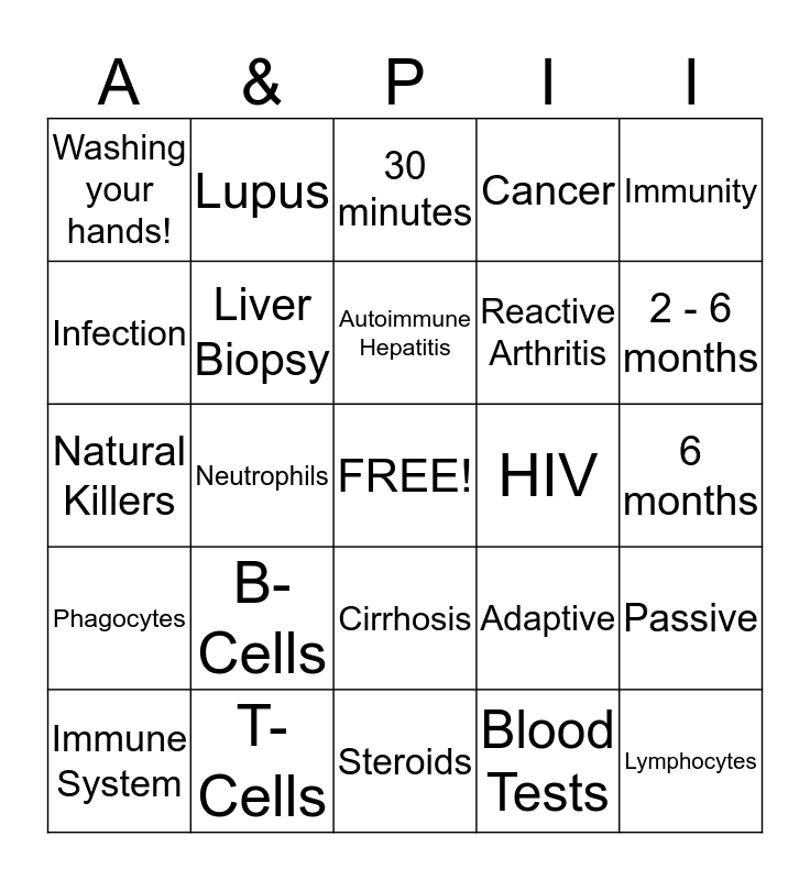 This bingo card has a free space and 24 words: B-Cells, T-Cells, Autoimmune Hepatitis, Immune System, Immunity, Washing your hands!, Infection, Lupus, HIV, Cirrhosis, Reactive Arthritis, Natural Killers, Adaptive, Passive, Liver Biopsy, Blood Tests, 6 months, 30 minutes, 2 - 6 months, Neutrophils, Lymphocytes, Phagocytes, Cancer and Steroids.