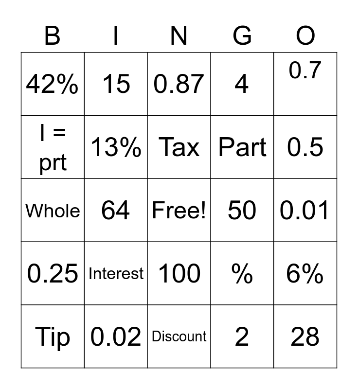 This bingo card has a free space and 25 words: Interest, Discount, Tax, Tip, 0.7, 42%, I = prt, 15, 50, 100, Part, Whole, %, 6%, 13%, 72.5%, 0.01, 0.87, 0.5, 64, 28, 0.02, 0.25, 4 and 2.