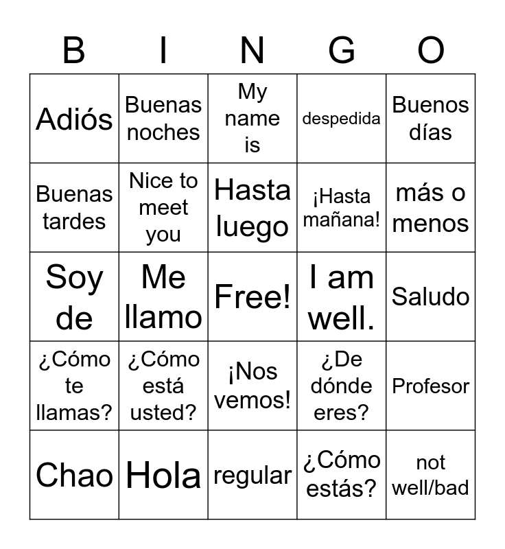 This bingo card has a free space and 24 words: ¿Cómo está usted?, Hola, Hasta luego, Chao, Buenos días, Adiós, Buenas tardes, Buenas noches, I am well., ¡Nos vemos!, ¡Hasta mañana!, Soy de, ¿De dónde eres?, Profesor, Nice to meet you, ¿Cómo estás?, Saludo, My name is, más o menos, Me llamo, not well/bad, ¿Cómo te llamas?, despedida and regular.