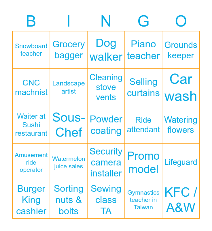 This bingo card has 36 words: Lighting engineer, Build furniture, Lead Firefighter, Landscape artist, Promo model, Amusement ride operator, Cleaning stove vents, Grocery clerk, Grounds keeper, Physics teacher, Sous-Chef, Piano teacher, Library book stacker, Ride attendant, Car wash, Snowboard teacher, KFC / A&W, Watermelon juice sales, Powder coating, Dog walker, Watering flowers, Lifeguard, Sorting nuts & bolts, Burger King cashier, Sewing class TA, Grocery bagger, Waiter at Sushi restaurant, Crosssfit trainer, Selling curtains, CNC machnist, Zero-G test subject, Coffee house, Gymnastics teacher in Taiwan, Security camera installer, Insurance Adjuster and Bingo game dealer.