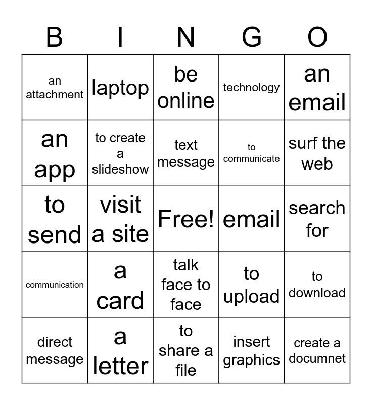 This bingo card has a free space and 24 words: a card, a letter, text message, direct message, an email, an attachment, an app, laptop, email, talk face to face, to communicate, to send, to upload, to download, to create a slideshow, insert graphics, search for, be online, surf the web, visit a site, create a documnet, communication, technology and to share a file.