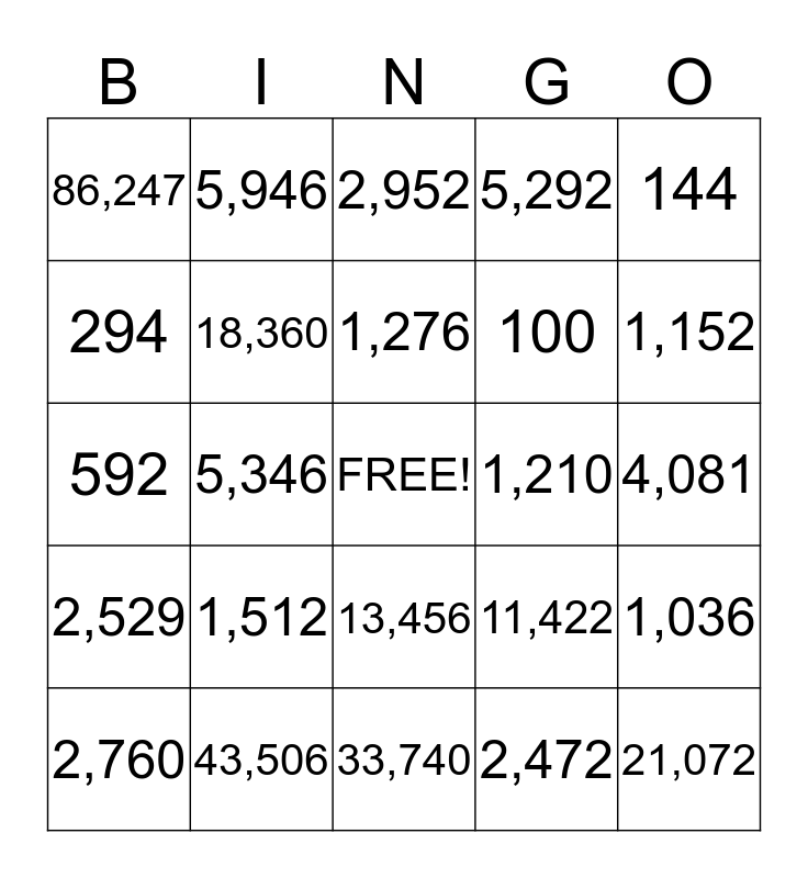 This bingo card has a free space and 24 words: 1,512, 43,506, 1,276, 2,760, 144, 86,247, 294, 5,946, 1,210, 13,456, 100, 592, 11,422, 1,036, 18,360, 2,472, 4,081, 2,952, 1,152, 5,346, 21,072, 2,529, 5,292 and 33,740.