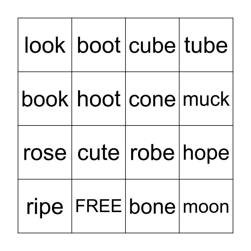 This bingo card has 24 words: duck, truck, muck, luck, book, look, hoot, boot, FREE, hose, rose, robe, lobe, phone, cone, stone, bone, cube, cute, hope, ripe, moon, tube and spoon.