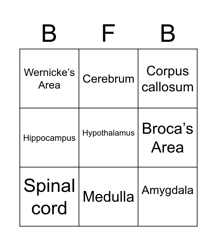 This bingo card has 14 words: Thalamus, Cerebellum, Spinal cord, Cerebrum, Hippocampus, Hypothalamus, Amygdala, Pons, Medulla, Wernicke’s Area, Angular Gyrus, Broca’s Area, Corpus callosum and Reticular formation.