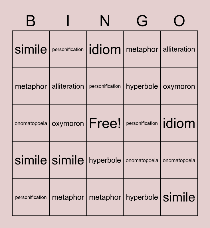 This bingo card has a free space and 25 words: simile, metaphor, personification, personification, alliteration, simile, metaphor, personification, personification, hyperbole, hyperbole, onomatopoeia, onomatopoeia, onomatopoeia, alliteration, alliteration, idiom, idiom, oxymoron, oxymoron, simile, metaphor, simile, metaphor and hyperbole.