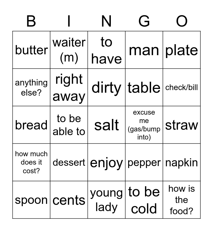 This bingo card has 71 words: restaurant, waiter (m), waitress (f), chef (m or f), young lady, young man, man, woman, table, sugar, spoon, knife, check/bill, butter, menu, bread, pepper, plate, main dish, straw, dessert, salt, napkin, chair, mug/cup, bowl, fork, glass, money, dollars, cents, change, tip, to be hot, to be cold, to be hungry, to be thirsty, to be sleepy, anything else?, here is..., enjoy, how is the food?, how much does it cost?, how much do they cost?, check, please, you're welcome, excuse me (get attention), right away, thank you, I recommend to you (formal), Can you (formal) bring me...?, another, excuse me (gas/bump into), What do you want to eat?, one moment, clean, dirty, perfect, to cost, to give, to desire, to order/ask for, to be able to, to want, to recommend, to serve, to have, to bring, I am missing/lacking, to drink and to eat.