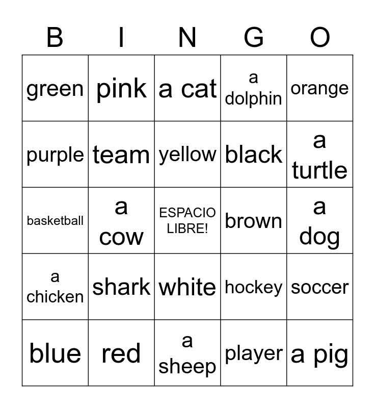 This bingo card has a free space and 24 words: shark, red, yellow, blue, orange, green, purple, pink, brown, white, black, basketball, hockey, soccer, team, player, a dog, a cat, a turtle, a cow, a pig, a chicken, a dolphin and a sheep.