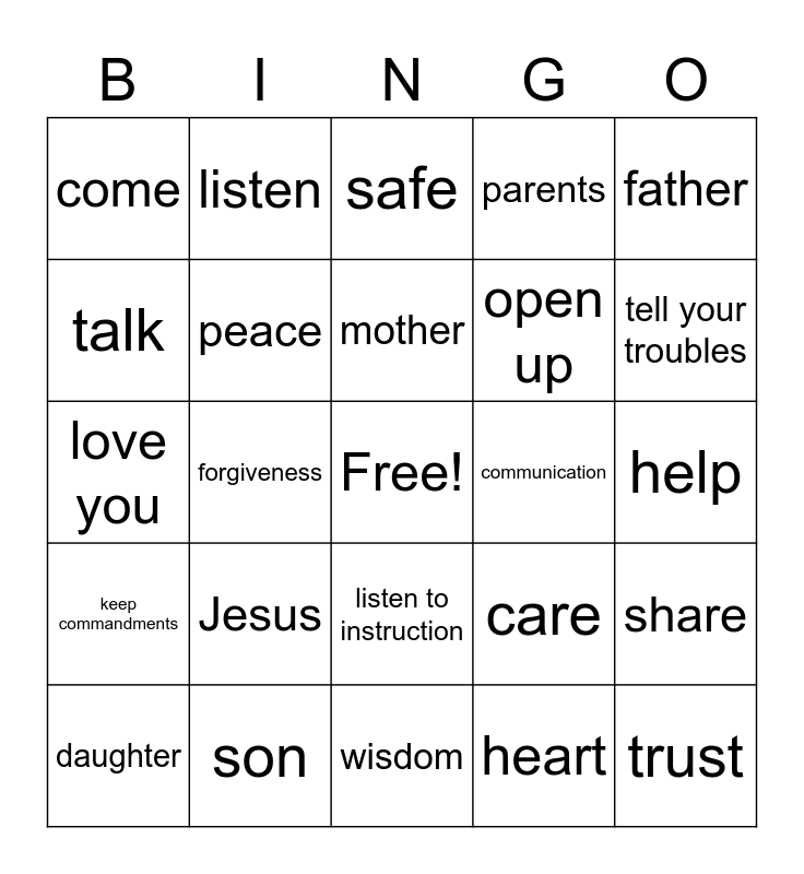This bingo card has a free space and 24 words: Jesus, son, mother, daughter, father, come, talk, listen, communication, listen to instruction, open up, love you, care, share, peace, heart, help, safe, tell your troubles, forgiveness, trust, keep commandments, parents and wisdom.