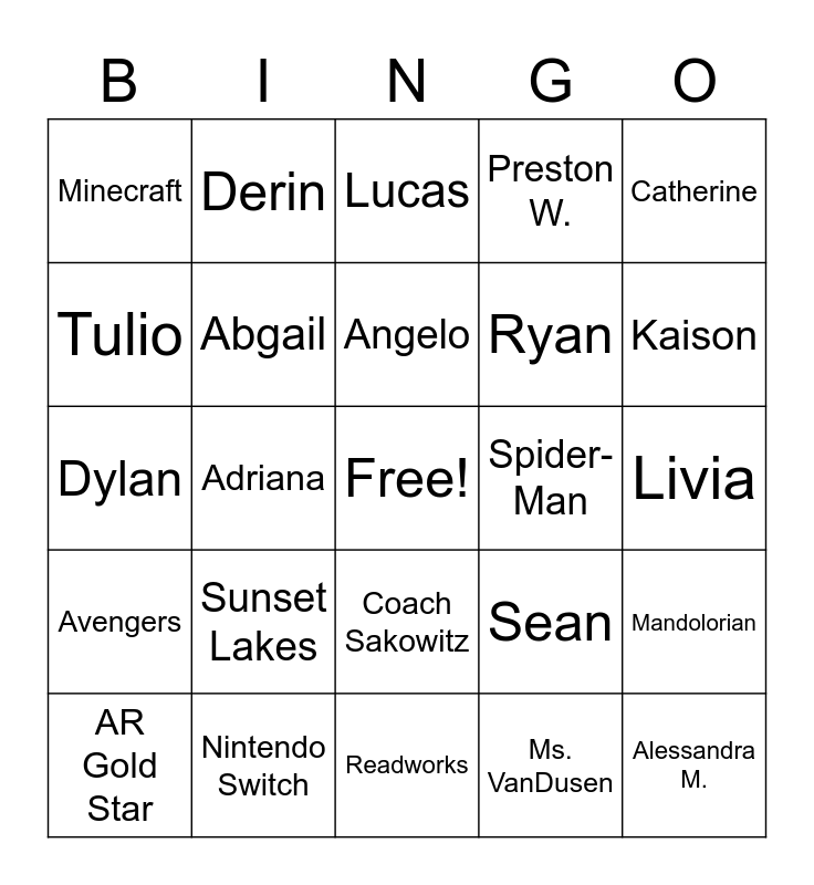 This bingo card has a free space and 75 words: Bella, Victoria, Lucas, Miranda, Max, Daniel, David, Lauren, Pedro, Logan, Sylah, Noah, Angelo, Tulio, Mila, Adriana, Gabriella, Alessandra M., Alyssa, Catherine, Siena, Dylan, Abgail, Derin, Preston W., Preston E., Olivia, Cristian, Luke, Bridgette, Royce, Alessandra L., Justin, Sean, Kaison, Ryan, Elin, Kaylee, Livia, Ms. VanDusen, Ms. Miret, Ms. Goulette, Mr. Albright, Roblox, Officer Lyttle, IReady, AR Gold Star, Minecraft, Legos, Eagles, Ms. Yanow, Coach Sakowitz, 3rd Grade!, Recess, Lunch Break, Cartoon Network, Disney, Clever, Canvas, Kahoot!, Sunset Lakes, Mr. Colina, Go Noodle, Miramar, Florida, Spider-Man, Descendants*, Teen Titans, Star Wars, Mandolorian, Avengers, Nintendo Switch, Epic, Readworks and Teams.