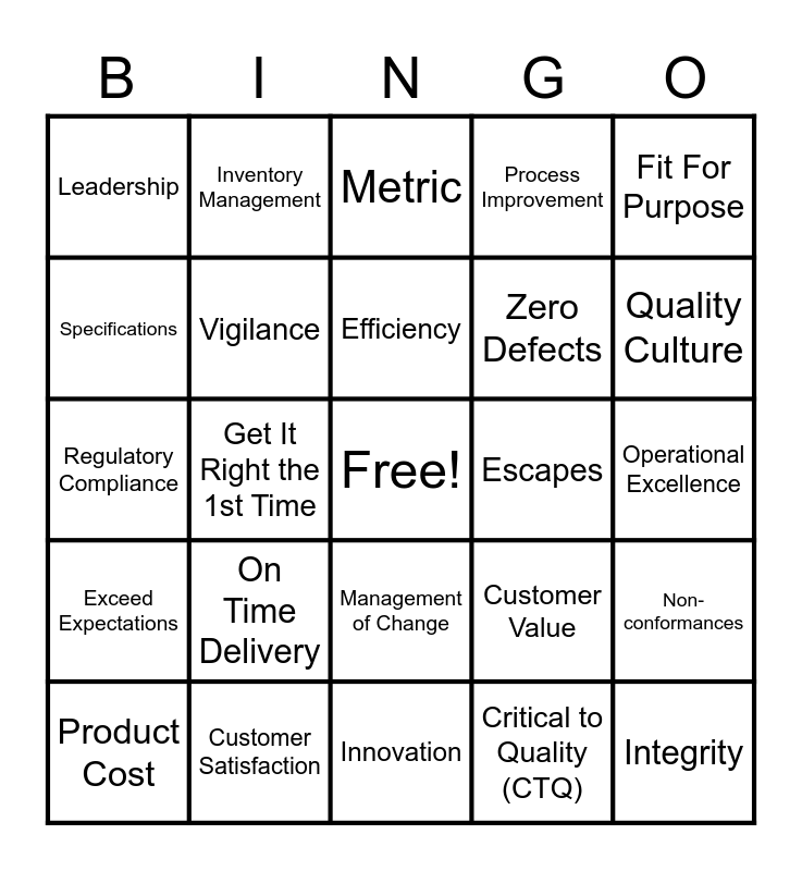 This bingo card has a free space and 24 words: On Time Delivery, Customer Satisfaction, Efficiency, Product Cost, Fit For Purpose, Leadership, Specifications, Inventory Management, Escapes, Management of Change, Zero Defects, Regulatory Compliance, Customer Value, Non-conformances, Vigilance, Critical to Quality (CTQ), Operational Excellence, Metric, Quality Culture, Get It Right the 1st Time, Integrity, Exceed Expectations, Process Improvement and Innovation.