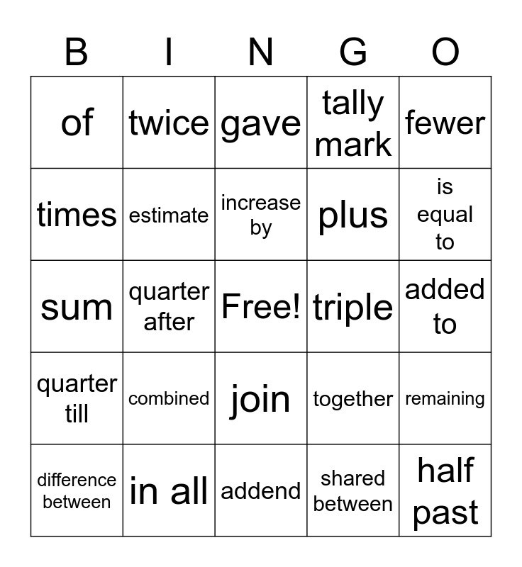 This bingo card has a free space and 24 words: combined, in all, increase by, difference between, fewer, of, times, twice, triple, join, plus, sum, together, remaining, estimate, shared between, added to, gave, is equal to, quarter after, half past, quarter till, tally mark and addend.