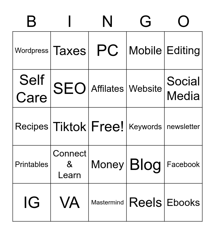 This bingo card has a free space and 29 words: Email, VA, PC, Phone, Editing, Wordpress, SEO, Affilates, Keywords, Facebook, IG, Tiktok, Reels, Ebooks, Recipes, Crafts, Mastermind, Blog, Social Media, Printables, Connect & Learn, Groups, Website, newsletter, Self Care, Taxes, Money, Mobile and Traffic.