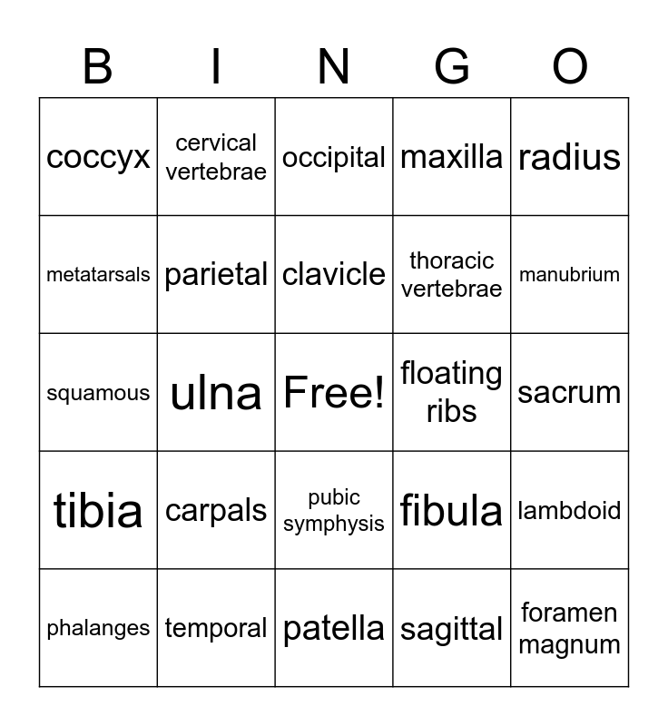 This bingo card has a free space and 39 words: mandible, femur, coxal, parietal, phalanges, pubic symphysis, clavicle, xiphoid process, radius, tibia, ulna, maxilla, foramen magnum, sacrum, floating ribs, carpals, humerus, coccyx, scapula, fibula, metatarsals, patella, thoracic vertebrae, manubrium, lumbar vertebrae, metacarpals, tarsals, zygomatic, ribs, cervical vertebrae, atlas, axis, occipital, temporal, sagittal, nasal, lambdoid, squamous and coronal.