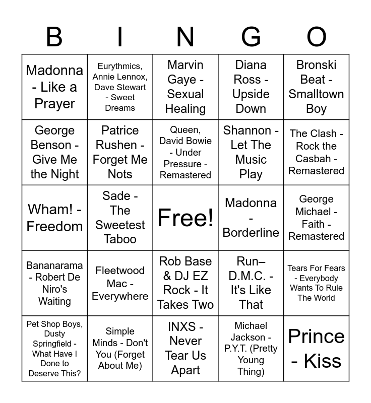 This bingo card has a free space and 50 words: New Order - Blue Monday, Prince - Kiss, Whitney Houston - How Will I Know, INXS - Never Tear Us Apart, Fleetwood Mac - Everywhere, Soul II Soul, Caron Wheeler - Back To Life, Eurythmics, Annie Lennox, Dave Stewart - Sweet Dreams, Pet Shop Boys - West End Girls - 2001 Remaster, George Benson - Give Me the Night, Salt-N-Pepa - Push It, Patrice Rushen - Forget Me Nots, Diana Ross - Upside Down, Tears For Fears - Everybody Wants To Rule The World, Run–D.M.C. - It's Like That, Michael Jackson - Billie Jean, Blondie - Call Me, Queen, David Bowie - Under Pressure - Remastered, Madonna - Borderline, David Bowie - Modern Love - 1999 Remaster, Bronski Beat - Smalltown Boy, Sade - The Sweetest Taboo, Michael Jackson - P.Y.T. (Pretty Young Thing), Madonna - Like a Prayer, Shannon - Let The Music Play, New Order - Bizarre Love Triangle, The Specials - Ghost Town, The Clash - Rock the Casbah - Remastered, David Bowie - Let's Dance - 1999 Remaster, Marvin Gaye - Sexual Healing, Rob Base & DJ EZ Rock - It Takes Two, Luther Vandross - Never Too Much, Guns N' Roses - Welcome To The Jungle, Womack & Womack - Teardrops, The Human League - Don't You Want Me, Simple Minds - Don't You (Forget About Me), Culture Club - Karma Chameleon - Remastered, Daryl Hall & John Oates - Maneater, Cameo - Word Up, Billy Ocean - Caribbean Queen (No More Love On the Run), George Michael - Faith - Remastered, Bananarama - Venus, ABC - The Look Of Love - Pt. 1, Frankie Goes To Hollywood - Relax, Spandau Ballet - Gold, Pet Shop Boys, Dusty Springfield - What Have I Done to Deserve This?, Wham! - Freedom, The Style Council, Jay Mark - Shout To The Top, Madonna - Lucky Star, Bananarama - Robert De Niro's Waiting and Stevie Wonder - Part-Time Lover -.