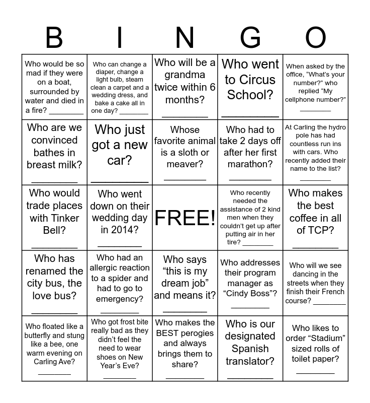 This bingo card has a free space and 24 words: Who had an allergic reaction to a spider and had to go to emergency? ________, Who got frost bite really bad as they didn’t feel the need to wear shoes on New Year’s Eve? ________, Whose favorite animal is a sloth or meaver? ________, Who floated like a butterfly and stung like a bee, one warm evening on Carling Ave? ________, When asked by the office, “What’s your number?” who replied “My cellphone number?” ________, Who would be so mad if they were on a boat, surrounded by water and died in a fire? ________, Who are we convinced bathes in breast milk? ________, Who can change a diaper, change a light bulb, steam clean a carpet and a wedding dress, and bake a cake all in one day? ________, Who recently needed the assistance of 2 kind men when they couldn’t get up after putting air in her tire? ________, Who says “this is my dream job” and means it? ________, Who had to take 2 days off after her first marathon? ________, Who would trade places with Tinker Bell? ________, Who addresses their program manager as “Cindy Boss”? ________, Who will we see dancing in the streets when they finish their French course? ________, Who just got a new car? ________, Who is our designated Spanish translator? ________, Who makes the best coffee in all of TCP? ________, Who will be a grandma twice within 6 months? ________, At Carling the hydro pole has had countless run ins with cars. Who recently added their name to the list? ________, Who went down on their wedding day in 2014? ________, Who likes to order “Stadium” sized rolls of toilet paper? ________, Who has renamed the city bus, the love bus? ________, Who went to Circus School? ________ and Who makes the BEST perogies and always brings them to share? ________.