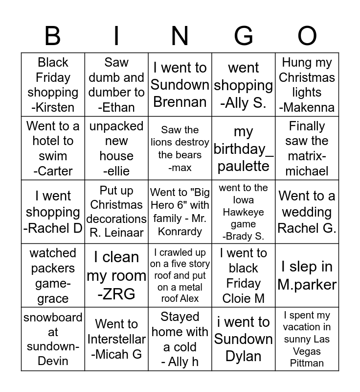 This bingo card has a free space and 24 words: I clean my room -ZRG, Went to Interstellar -Micah G, Saw the lions destroy the bears -max, snowboard at sundown-Devin, Hung my Christmas lights -Makenna, Black Friday shopping -Kirsten, Went to a hotel to swim -Carter, Saw dumb and dumber to -Ethan, went to the Iowa Hawkeye game -Brady S., I crawled up on a five story roof and put on a metal roof Alex, my birthday_ paulette, I went shopping -Rachel D, I went to black Friday Cloie M, I slep in M.parker, unpacked new house -ellie, i went to Sundown Dylan, Went to a wedding Rachel G., I went to Sundown Brennan, Finally saw the matrix-michael, Put up Christmas decorations R. Leinaar, I spent my vacation in sunny Las Vegas Pittman, watched packers game-grace, went shopping -Ally S. and Stayed home with a cold - Ally h.