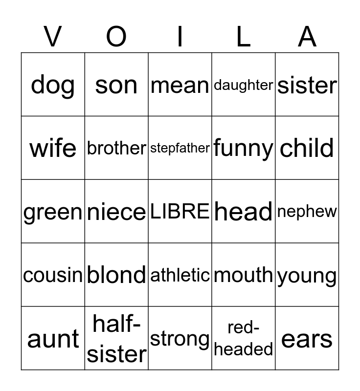This bingo card has a free space and 24 words: blond, half-sister, stepfather, aunt, sister, dog, wife, son, head, athletic, funny, green, mouth, young, brother, red-headed, nephew, mean, child, niece, ears, cousin, daughter and strong.