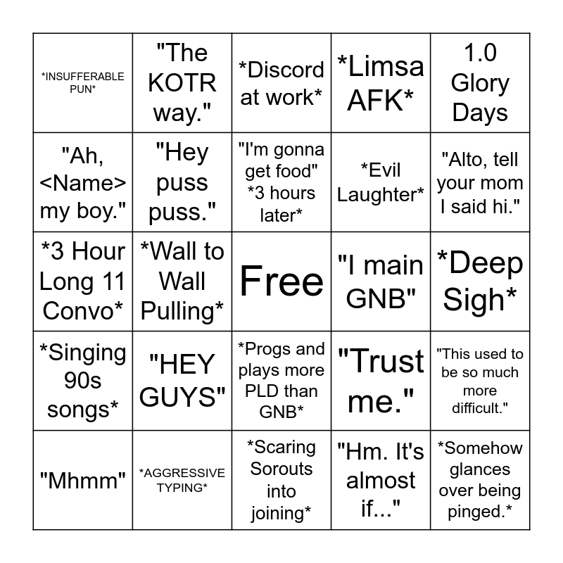 This bingo card has a free space and 24 words: "HEY GUYS", *AGGRESSIVE TYPING*, "I'm gonna get food" *3 hours later*, "Mhmm", 1.0 Glory Days, *INSUFFERABLE PUN*, "Ah, <Name> my boy.", "The KOTR way.", "I main GNB", *Progs and plays more PLD than GNB*, *Evil Laughter*, *3 Hour Long 11 Convo*, "Trust me.", "This used to be so much more difficult.", "Hey puss puss.", "Hm. It's almost if...", *Deep Sigh*, *Discord at work*, "Alto, tell your mom I said hi.", *Wall to Wall Pulling*, *Somehow glances over being pinged.*, *Singing 90s songs*, *Limsa AFK* and *Scaring Sorouts into joining*.
