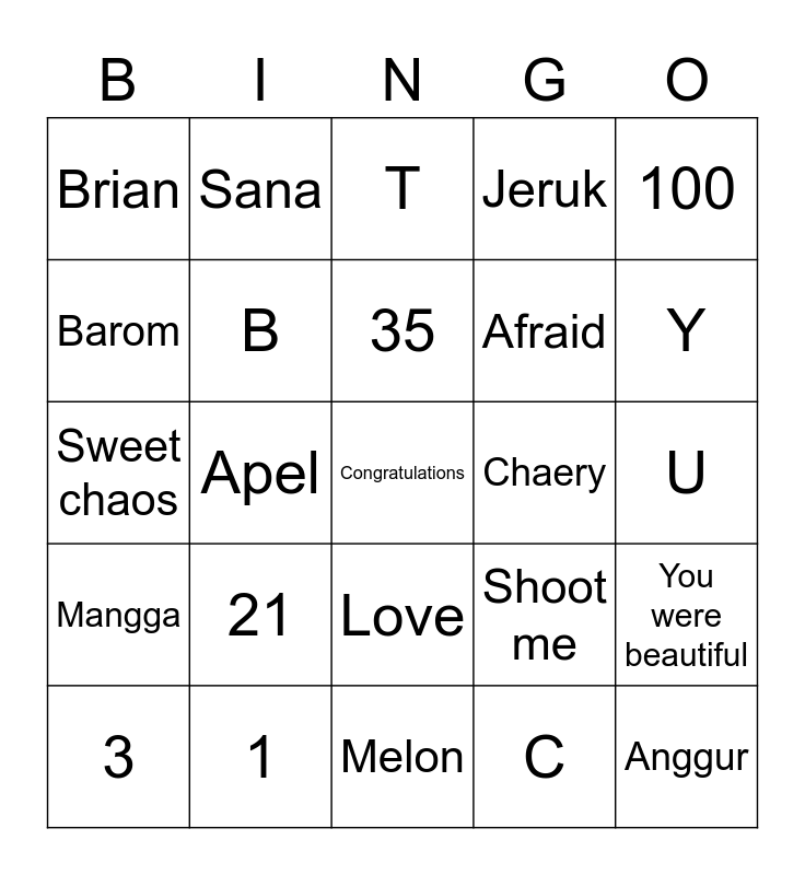 This bingo card has a free space and 24 words: 21, 1, 35, 3, 100, Brian, Barom, Sana, Chaery, Love, Afraid, Sweet chaos, Shoot me, You were beautiful, B, C, U, T, Y, Apel, Anggur, Mangga, Jeruk and Melon.