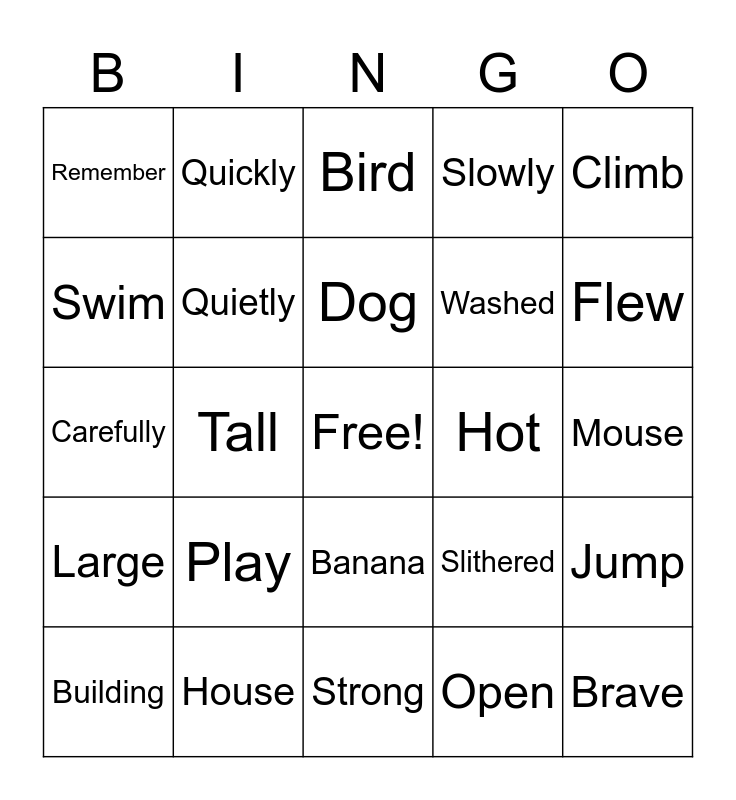 This bingo card has a free space and 24 words: Play, House, Dog, Building, Climb, Remember, Swim, Quickly, Hot, Banana, Washed, Carefully, Slithered, Jump, Quietly, Open, Mouse, Bird, Flew, Tall, Brave, Large, Slowly and Strong.