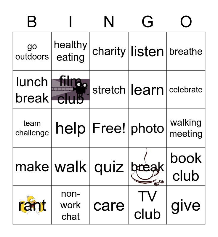 This bingo card has 3 images, a free space and 24 words: walk, non-work chat, stretch, rant, breathe, go outdoors, lunch break, healthy eating, photo, quiz, learn, team challenge, break, book club, film club, TV club, walking meeting, charity, celebrate, help, give, make, listen and care.
