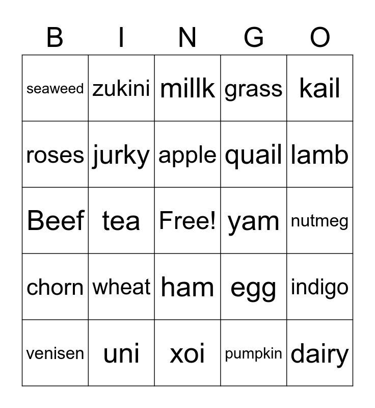 This bingo card has a free space and 24 words: wheat, uni, apple, venisen, kail, seaweed, roses, zukini, yam, ham, quail, Beef, egg, indigo, jurky, pumpkin, nutmeg, millk, lamb, tea, dairy, chorn, grass and xoi.