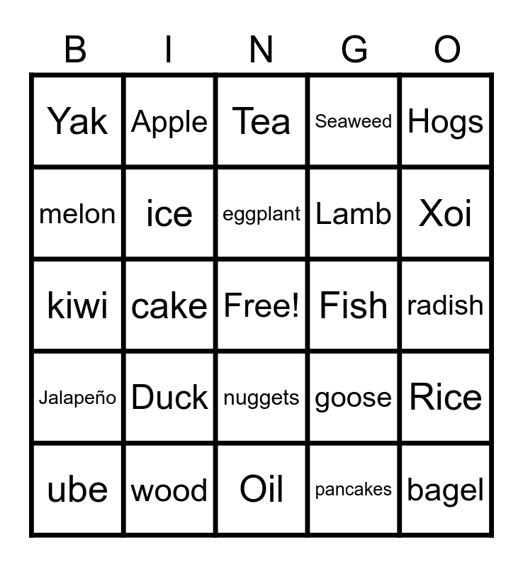 This bingo card has a free space and 24 words: Duck, wood, eggplant, ube, Hogs, Yak, melon, Apple, Fish, nuggets, Lamb, kiwi, goose, Rice, ice, pancakes, radish, Tea, Xoi, cake, bagel, Jalapeño, Seaweed and Oil.