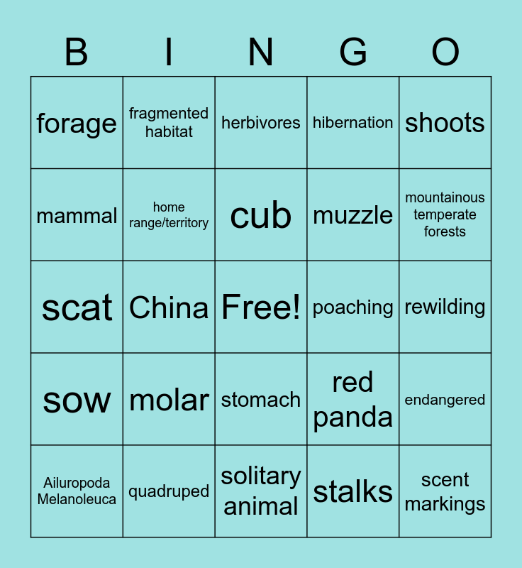 This bingo card has a free space and 29 words: Ailuropoda Melanoleuca, bamboo die-off, China, Deforestation, forage, herbivores, home range/territory, molar, poaching, quadruped, rewilding, scent markings, solitary animal, stalks, mountainous temperate forests, thumbs, stomach, sow, shoots, scat, red panda, preserve/ reserve, muzzle, mammal, hibernation, fragmented habitat, endangered, cub and boar.