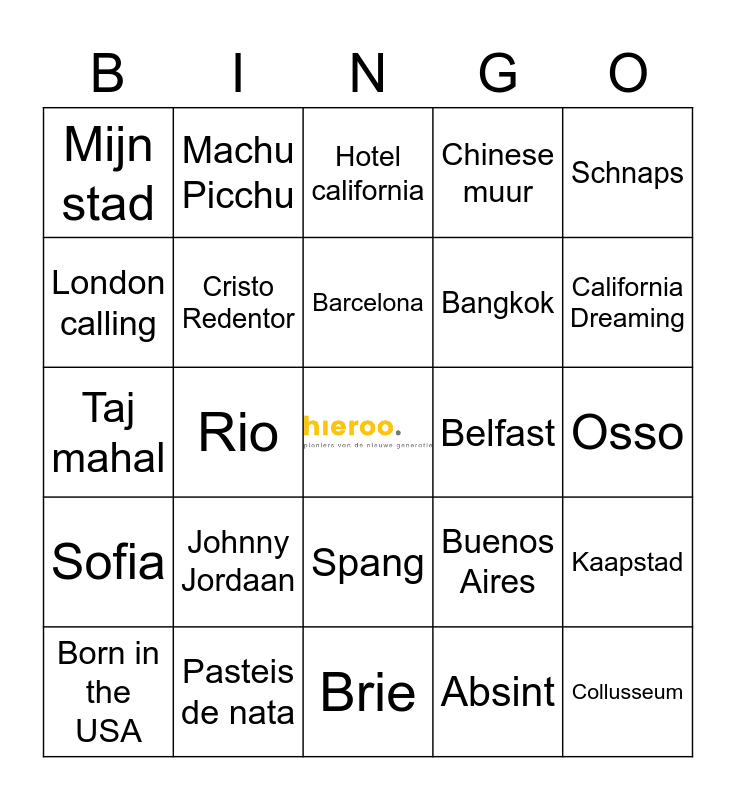 This bingo card has a free space and 74 words: Africa (toto), Anton aus tirol, Hotel california, Get spanish, America, Havana, We are going to ibiza, Brazil (la la la), Born in the USA, Liefs uit London, Big in Japan, Mexico, Barcelona, London calling, Parijs, Rio, New York, California Dreaming, België, Taj mahal, Cristo Redentor, Machu Picchu, Chinese muur, Chichen itza, Collusseum, Petra, Wodka, Tequilia, Champagne, Port, Schnaps, Limonciello, Licor 43, Pisang Ambon, Ouzo, Absint, Rendang, Loempia, Fish and Chips, Braai, Brie, Pasteis de nata, Dumpling, Baklava, Albert Kuyp, Mijn stad, Ten Hag, Johnny Jordaan, Amsterdam, Kopstoot, Femke Halsema, Skeer, Osso, Fatoe, Fissa, Tantoe, Spang, Patta’s, Een meier, Kaapstad, Bangkok, Seoel, Sofia, Helsinki, Belfast, Ottawa, Canberra, Wellington, Buenos Aires, Bogota, Lima, Willemstad, Edinburgh and Islamabad.