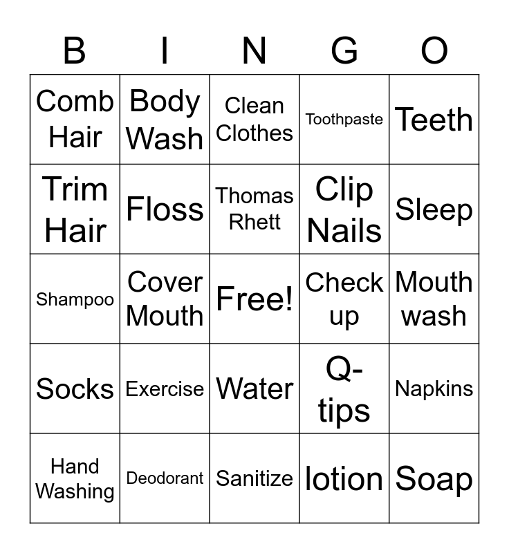 This bingo card has a free space and 29 words: Hand Washing, Shower Daily, Cover Mouth, Brush Teeth, Comb Hair, Clean Clothes, Floss, Exercise, Check up, Deodorant, Mouth wash, Soap, Sanitize, lotion, Sleep, Tissues, Water, Socks, Teeth, Shampoo, Q-tips, Wash Face, Clip Nails, Trim Hair, Toothpaste, Body Wash, Napkins, Thomas Rhett and Chris Young.