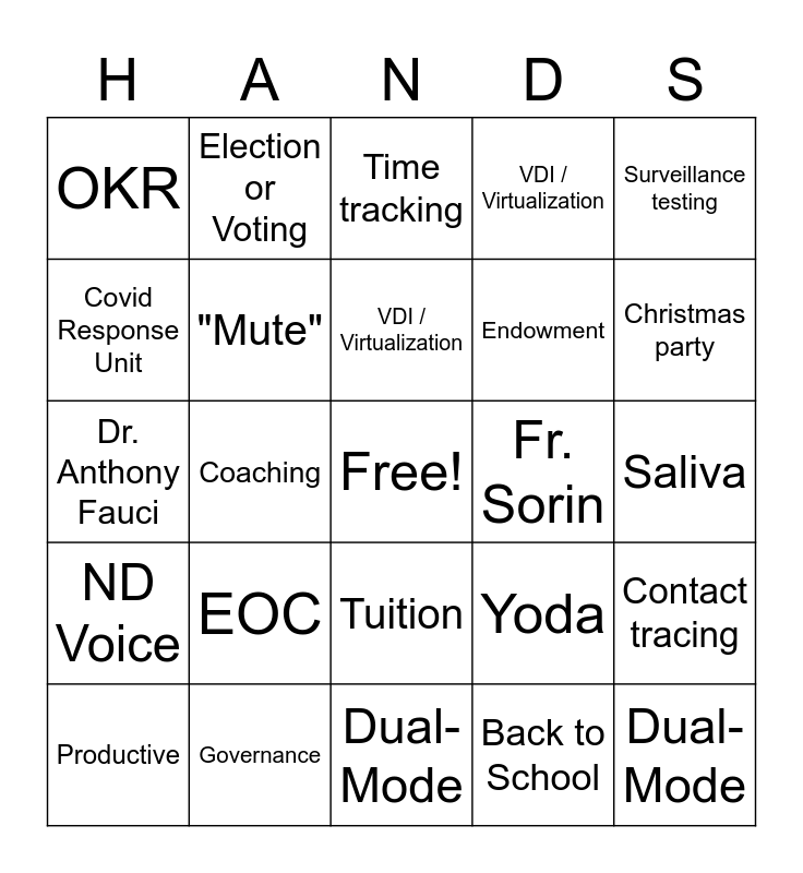 This bingo card has a free space and 111 words: Mike Rupley, John Gohsman health, Performance reviews, Adam Hill, Hand sanitizer, Layoffs or furloughs, Someone forgets their mic is on, Someone picking their nose, Okta, Tighten our belts, Presidential Debate, ITC 226, Sponsor, The Market, Endowment, Exercise, Tuition, Marie Lynn Miranda, Fr. Jenkins, Shannon Cullinan, Productive, Time tracking, "Mute", Low-hanging fruit, Diversity and Inclusion, ND Voice, Governance, Prioritization, Global Gateways, Unmuted person gets interrupted by family, OKR, Coaching, Football season, Mission, Childcare, EOC, Ireland, Flexible, Back to School, Fr. Sorin, Contact tracing, Goals, IBM, API, VDI / Virtualization, Storage, Dual-Mode, Zoom fatigue, Communications, Hyflex, here.nd.edu, Surveillance testing, IBM, Childcare, Antibody or Antigen, Board of Trustees, Covid Response Unit, Dr. Anthony Fauci, Culture, John Gohsman health, Adam Hill, Layoffs or furloughs, Someone forgets their mic is on, Sponsor, The Market, Endowment, Tuition, Marie Lynn Miranda, Shannon Cullinan, "Mute", Christmas party, Diversity and Inclusion, ND Voice, Governance, Prioritization, Global Gateways, Unmuted person gets interrupted by family, OKR, Clemson, EOC, Flexible, Back to School, Fr. Sorin, Contact tracing, Goals, API, VDI / Virtualization, Storage, Dual-Mode, here.nd.edu Dashboard, Surveillance testing, IBM, Childcare, Antibody, Antigen, or PCR, Board of Trustees, Covid Response Unit, Dr. Anthony Fauci, Culture, Compliance, Testing Center, Spring 2021, Burnout, Heroes, e-Learning, Yoda, Election or Voting, Coffee House, Winterim / Winter Session, Electoral college, Saliva and Spit tube.