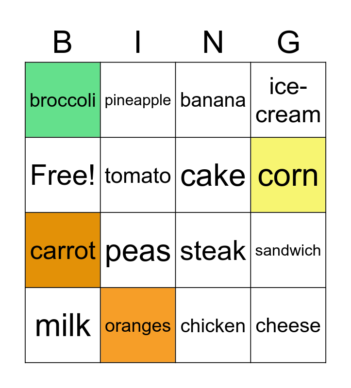 This bingo card has 24 words: potato, cucumber, corn, bread, Free!, broccoli, tomato, pineapple, oranges, mushroom, carrot, steak, apple, pizza, cake, sausage, chicken, banana, peas, sandwich, milk, cheese, ice-cream and lollipop.