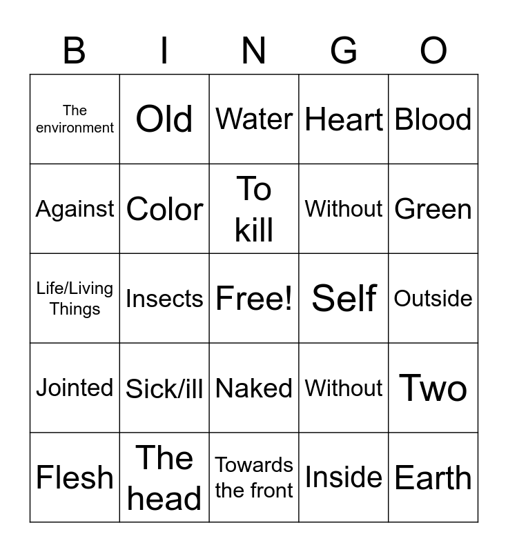 This bingo card has a free space and 27 words: Without, Both, Without, Towards the front, Against, Water, Old, Jointed, Self, Two, Life/Living Things, Heart, Flesh, The head, Green, Cartilage, Color, To kill, Sick/ill, The environment, Outside, Inside, Insects, Earth, Naked, Blood and Green plant without bark.