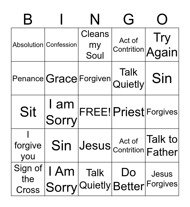 This bingo card has a free space and 24 words: Sin, I Am Sorry, Forgiven, Sign of the Cross, Try Again, Absolution, Penance, Confession, Priest, Jesus, Talk Quietly, Sit, Act of Contrition, Talk to Father, Grace, Do Better, Forgives, Cleans my Soul, Sin, I am Sorry, Jesus Forgives, I forgive you, Act of Contrition and Talk Quietly.