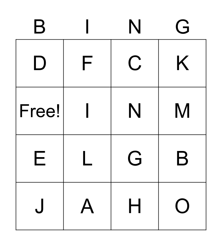 This bingo card has 16 words: A, B, C, D, E, F, G, H, Free!, I, J, K, L, M, N and O.