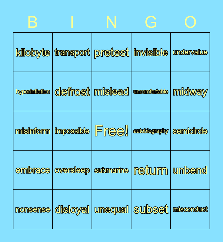This bingo card has a free space and 24 words: oversleep, disloyal, mislead, nonsense, undervalue, kilobyte, hyperinflation, transport, autobiography, submarine, uncomfortable, misinform, return, unbend, defrost, subset, semicircle, pretest, midway, impossible, misconduct, embrace, invisible and unequal.